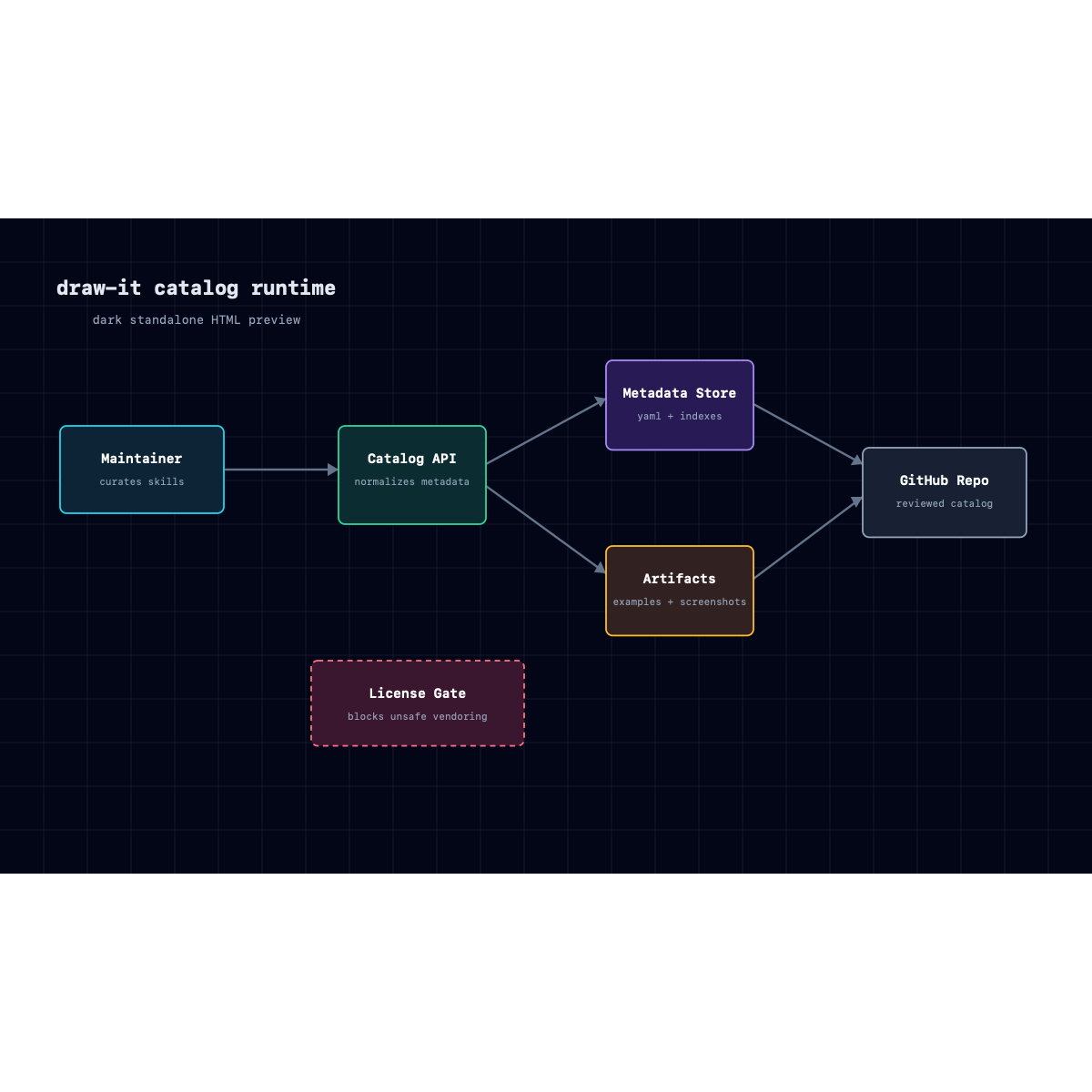 This skill targets polished architecture diagrams delivered as standalone HTML files. It is useful when the diagram is not just an inline asset, but a shareable visual page with a dark theme, summary cards, and inline SVG.